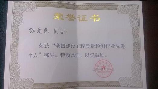 近日,從中國(guó)建筑業(yè)協(xié)會(huì)工程建設(shè)質(zhì)量監(jiān)督與檢測(cè)分會(huì)傳來(lái)喜訊,我公司孫愛(ài)民副總經(jīng)理榮獲全國(guó)建設(shè)工程檢測(cè)行業(yè)先進(jìn)個(gè)人。
